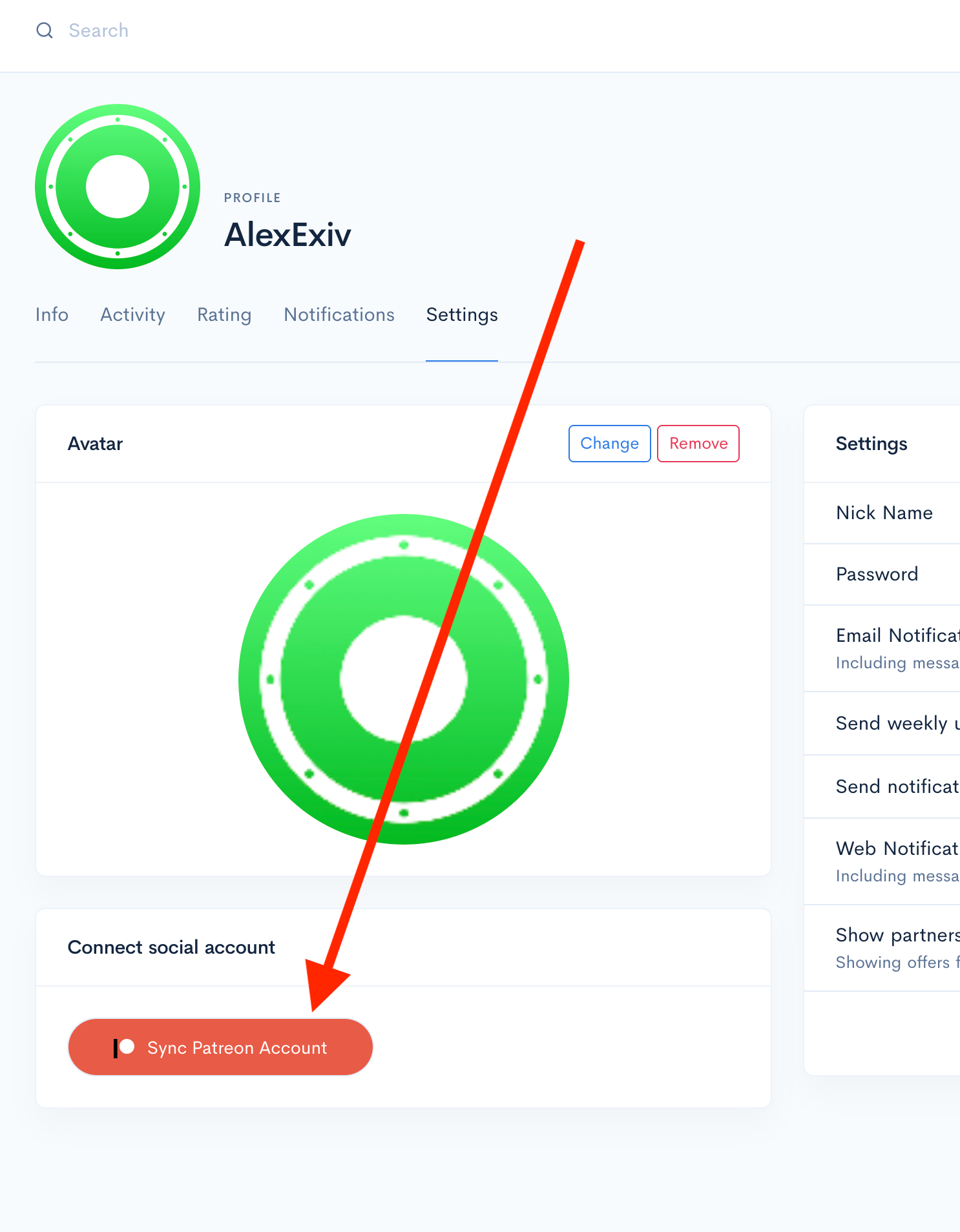 Снова откройте страницу профиля во вкладке Settings. Кнопка, на которой раньше было написано «Patreon Account», теперь должна измениться на «Sync Patreon Account» (как на третьем скриншоте).