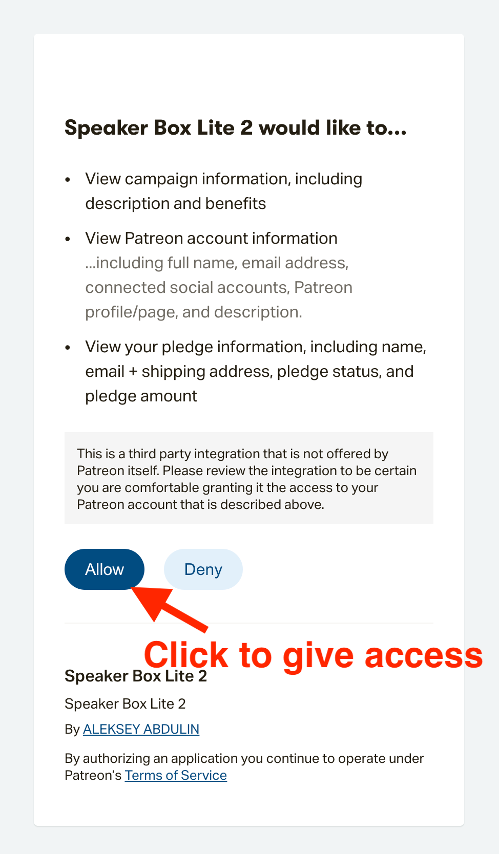 Aparecerá uma tela pedindo para conceder ao Speaker Box Lite acesso à sua página do Patreon, como na segunda captura de tela. Clique em Permitir para conceder o acesso.